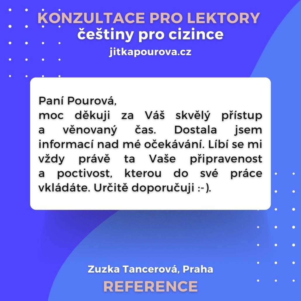 Kdo jsem? Lektorka s více než 25letou praxí s výukou češtiny ze státního školství i soukromé sféry. Od roku 2015 podnikám na volné noze. Učila jsem malé i dospělé Čechy, učím cizince, lektory a sama se stále učím. Více o mně najdete tady. Pro lektory taky vydávám zdarma online měsíčník Rozehrajte lekce češtiny, kde sdílím to, co mi v lekcích dobře funguje. Zajímalo by vás to? Stačí jednoduchá registrace. A na mém webu jste možná zaregistrovali blog a jeho sekci „pro lektory“.