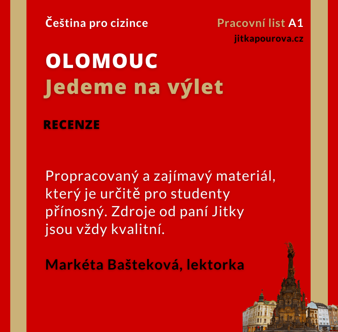 Česká republika není jenom Praha. Jsou tady další hezká města, například Olomouc. Město s krásnou architekturou, zajímavou historií a kulturní tradicí. S handoutem budete trénovat češtinu a dostanete tipy na výlet. Olomouc je jenom 2:30 hodiny od Prahy.