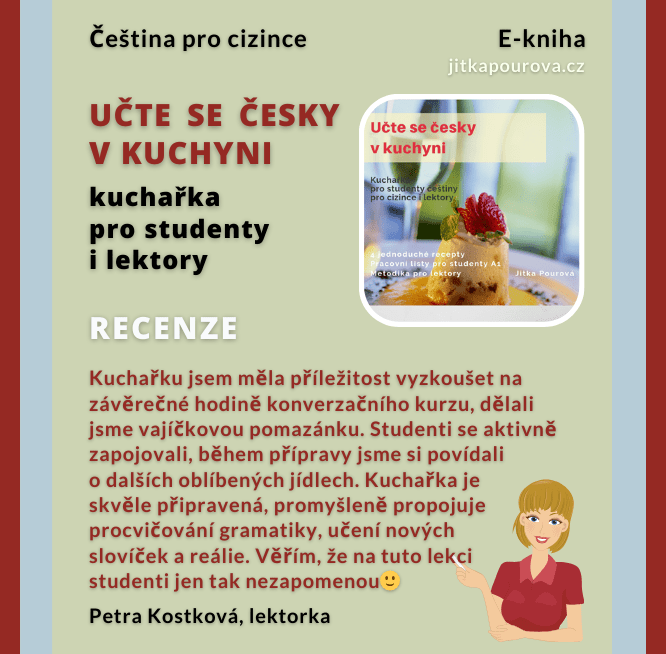 Kuchařku jsem měla příležitost vyzkoušet na závěrečné hodině konverzačního kurzu, dělali jsme vajíčkovou pomazánku. Studenti se aktivně zapojovali, během přípravy jsme si povídali o dalších oblíbených jídlech. Kuchařka je skvěle připravená, promyšleně propojuje procvičování gramatiky, učení nových slovíček a reálie. Věřím, že na tuto lekci studenti jen tak nezapomenou🙂